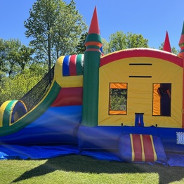The Castle Combo offers a 13 x 13 bounce area with basketball net. Your kids will love the slide and back into the bounce area. Total size with slide 13x27.