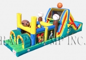 This is one beautifully colored and designed obstacle course. It is forty feet long of fun and challenging obstacles. It is pact with horizontal/vertical pop ups. At the end of the course is a wall climb followed by a steep slide. This is perfect for those sports fanatic's. We call it the Backyard All Star Course because it is compact enough to fit small yards